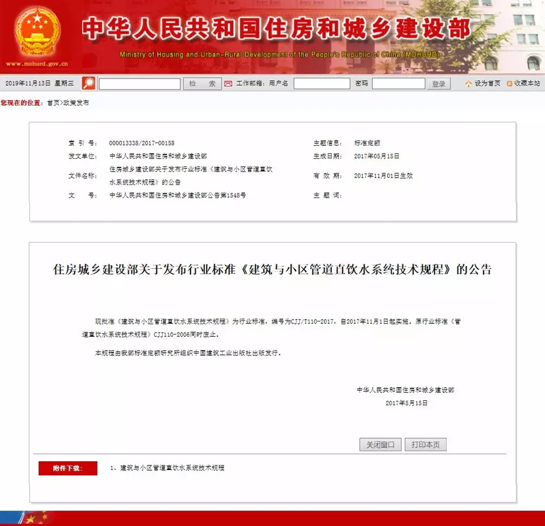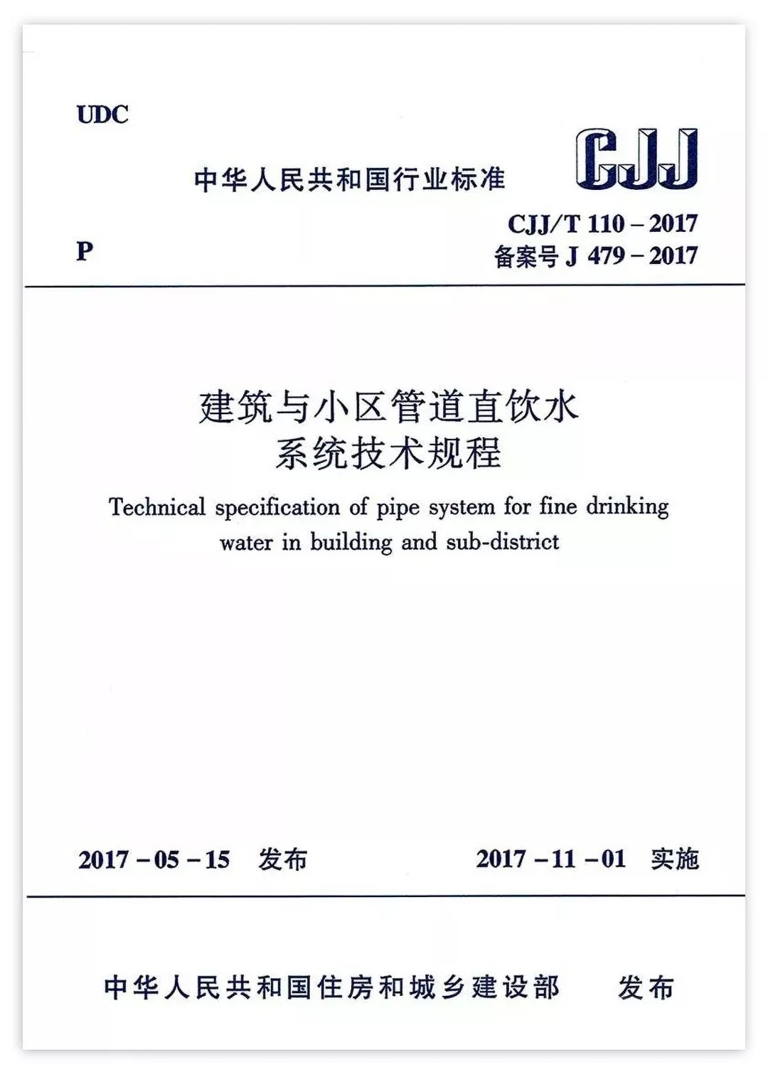 接著,住房城鄉(xiāng)建設部于2017年5月15日發(fā)布《建筑與小區(qū)管道直飲水系統(tǒng)技術規(guī)程》(編號:CJJ/T110-2017),自2017年11月1日起實施。原行業(yè)標準《管道直飲水系統(tǒng)技術規(guī)程》(CJJ110-2006)同時廢止。該規(guī)程十分明確地規(guī)定:“管材應選用不銹鋼管、銅管等符合食品級要求的優(yōu)質管材”。